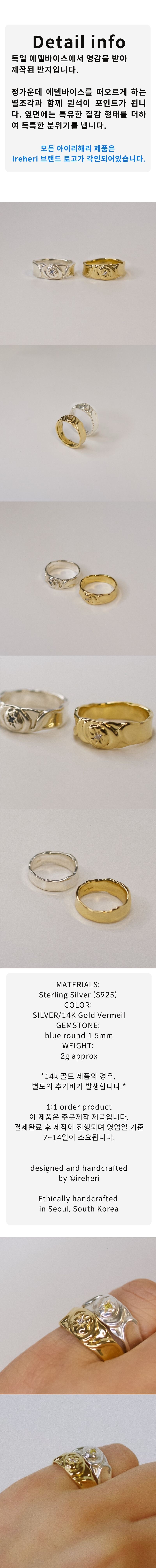 독일 에델바이스에서 영감을 받아 제작된 반지입니다. 정가운데 에델바이스를 떠오르게 하는 별조각과 함께 원석이 포인트가 됩니다. 옆면에는 특유한 질감 형태를 더하여 독특한 분위기를 냅니다.
